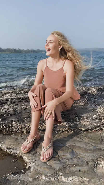 Soak in the sunshine, feel the warmth on your skin Our comfort-chic design, comes with an elastic back strap included and is heavily embellished with delicate rhinestone work, to catch the sunshine and reflect, wherever you go! As seen above, is our "Golden Glow-Getter" Flats. Get ready to style these timeless piece with all your resort wear looks for the season!